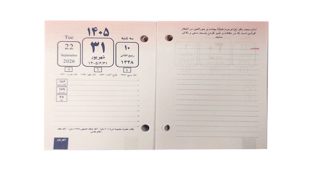 تقویم رومیزی پانچی کیمیا همراه با احادیث ائمه و اقات شرعی و دعای هنگام تحویل سال