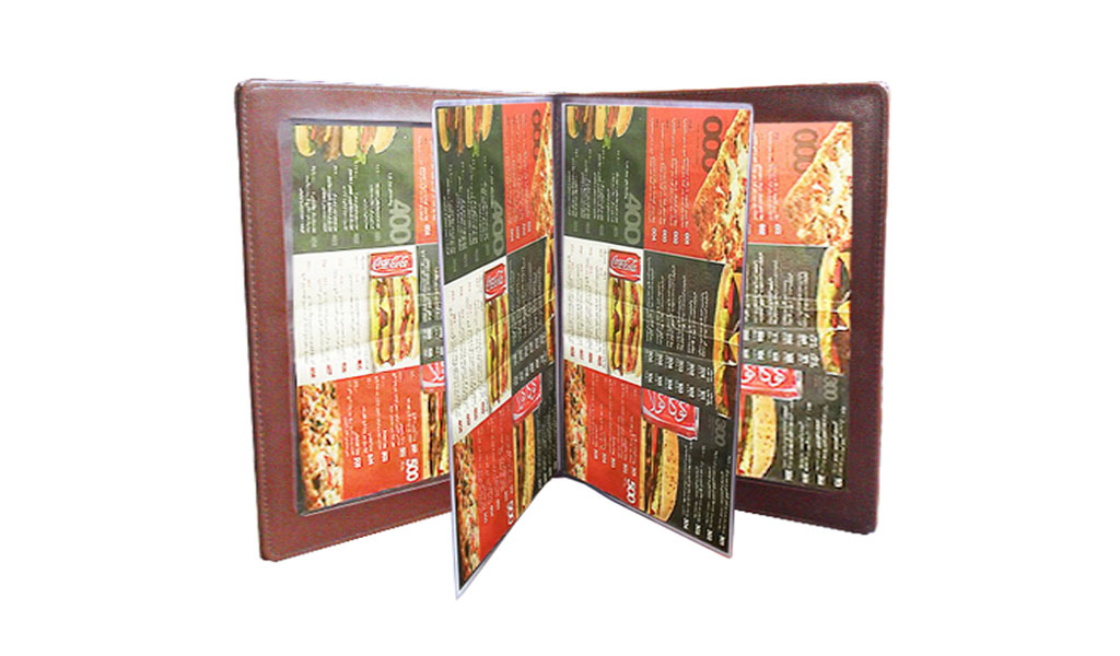 منوی رستوران کتابی جلد چرم دارای دو قاب در کناره های جلد برای قرار گیری دوبرگ منو و دو برگ در وسط برای قرار دادن 4 برگ منو بصورت پشت و رو می باشد سایز منو رستوران A4 و جمعاً 6 برگ منو را در خود جای می دهد .